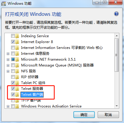 3)在Windows功能中勾选Telnet Client与Telnet Server,如图: