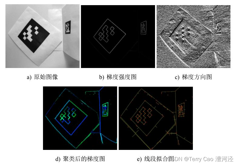 完成了图像中所有点的聚类,就可以使用加权最小二乘法来拟合直线的方程,每一点的权值就是该点的梯度的强度。通过直线的拟合,得到有向线段的两个端点的坐标p1和 p2,有向线段 p1 p2 的方向为线段p1 p2 的左侧亮度比右侧低。