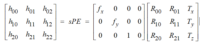 二维码的位置和姿态的计算需要额外的信息:相机的焦距和二维码的物理距离。3×3 的单应矩阵可以写成3×4的相机内参矩阵P和4×3的外参矩阵E的积。外参矩阵通常是4×4的,但是在二维码坐标系中的四个角点的坐标在z方向为0,所以就可以移除外参矩阵的第三列元素,使用旋转参数Rij和平移参数Tk来表示截取后的外参矩阵,那么单应矩阵就可以表示为: