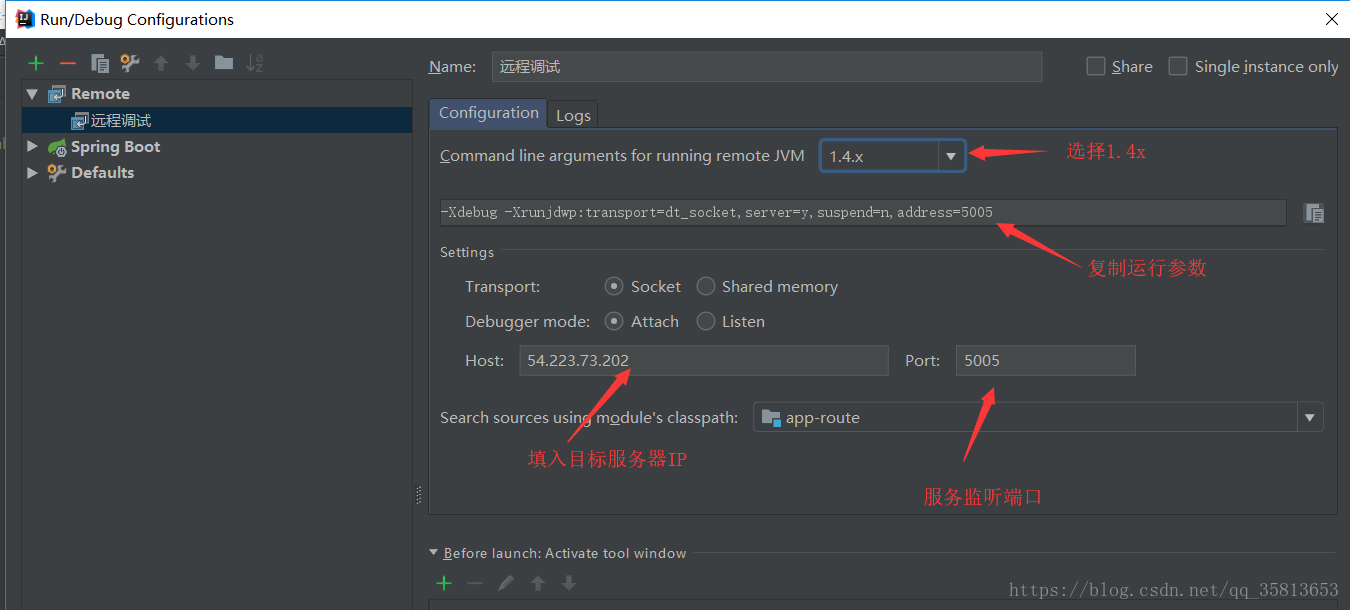 *注意运行参数在项目前面;输入 lsof -i:5005可以判断是否成功