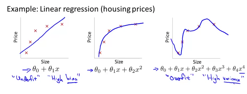 在前几篇博客中介绍了一元线性回归http://blog.csdn.net/u012328159/article/details/50994095和多元线性回归http://blog.csdn.net/u012328159/article/details/51029695等线性回归的知识,具体请参见本人其他博客。但是线性回归存在一个很重要的问题就是过拟合(overfitting)问题,所谓过拟合简单直白的说就是模型的训练误差极小,而检验误差很大。一个好的学习器不仅能够很好的拟合训练数据,而且能够对未知样本有很强的泛化能力,即低泛化误差。先来看看线性回归中的过拟合现象(自己不想画图了,直接盗用Andrew Ng大神的图吧):
