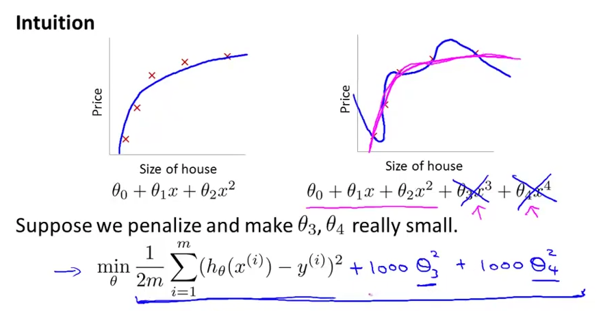 上图左边的二次曲线是我们希望的,右边的更高次的线性回归模型显然是过拟合的,但是如果在它的代价函数后面添加两项