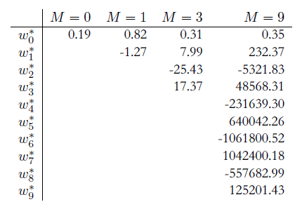 我们来看看随着多项式阶数的增加系数M是如何剧增的,见下表(来自PRML):