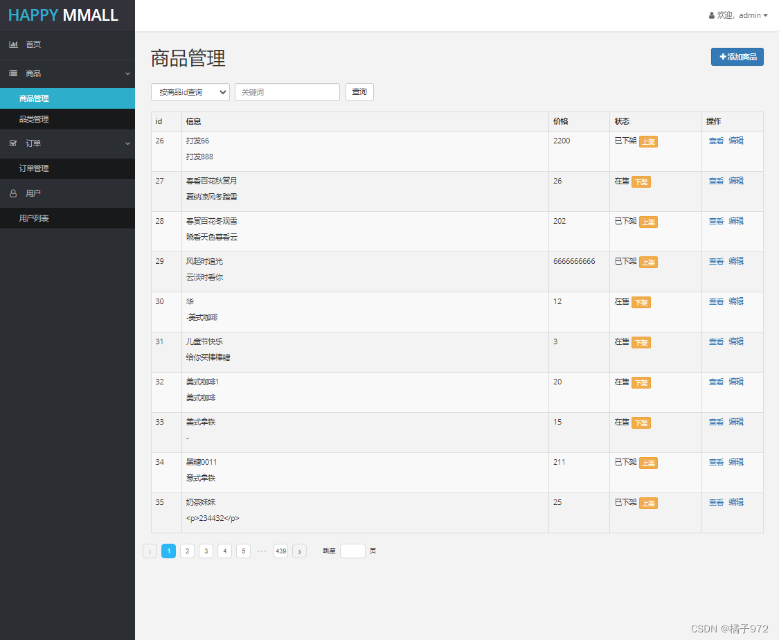 商品管理页面:主要功能点,商品查询,商品添加,上架,查看,编辑,分页