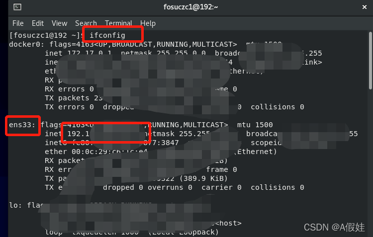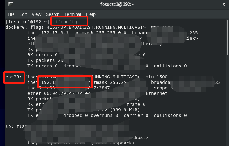 (4)使用ifconfig查看虚拟机的IP地址,这里的IP地址和之前的不一样,已经更改了,可能是进行网络编辑器的初始化了。