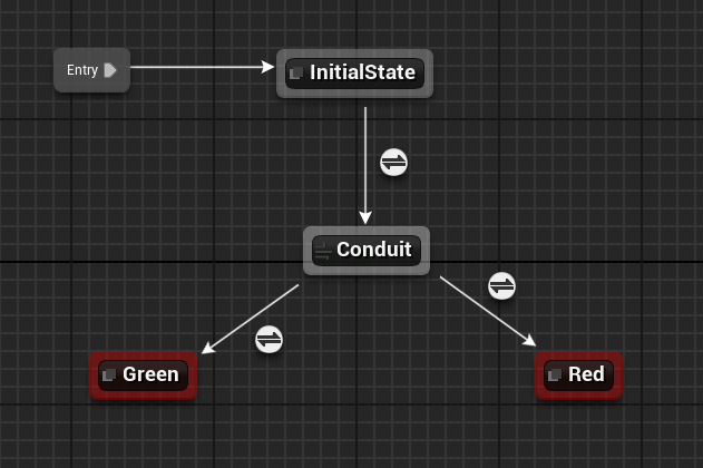 我们想要达成另一个效果:盒体红绿颜色的切换依靠逻辑判断,而不是简单地依靠读秒切换或盒体碰撞(overlap),此时我们可以用到状态机中的管线(Conduit),相关状态机蓝图如下: