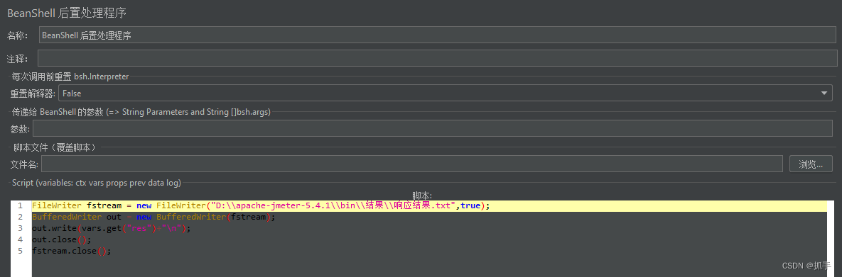 FileWriter fstream = new FileWriter("D:\\apache-jmeter-5.4.1\\bin\\结果\\响应结果.txt",true);