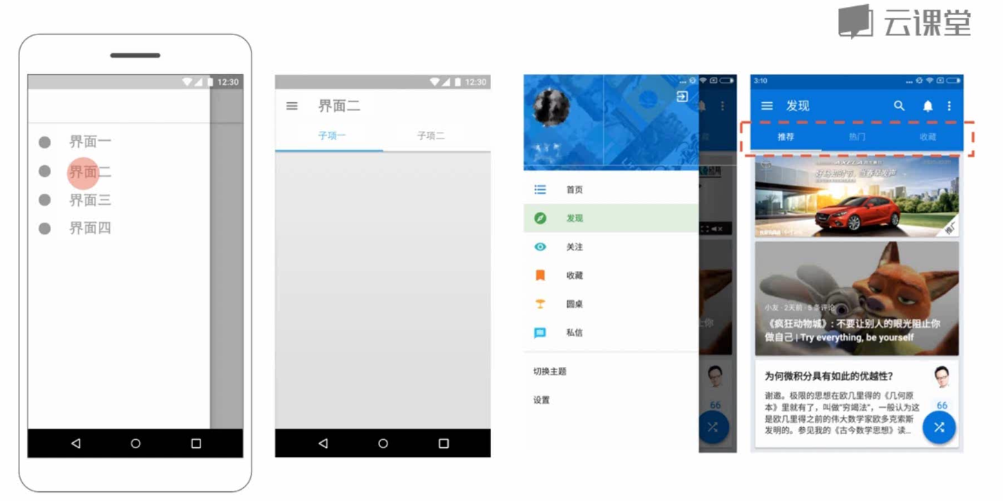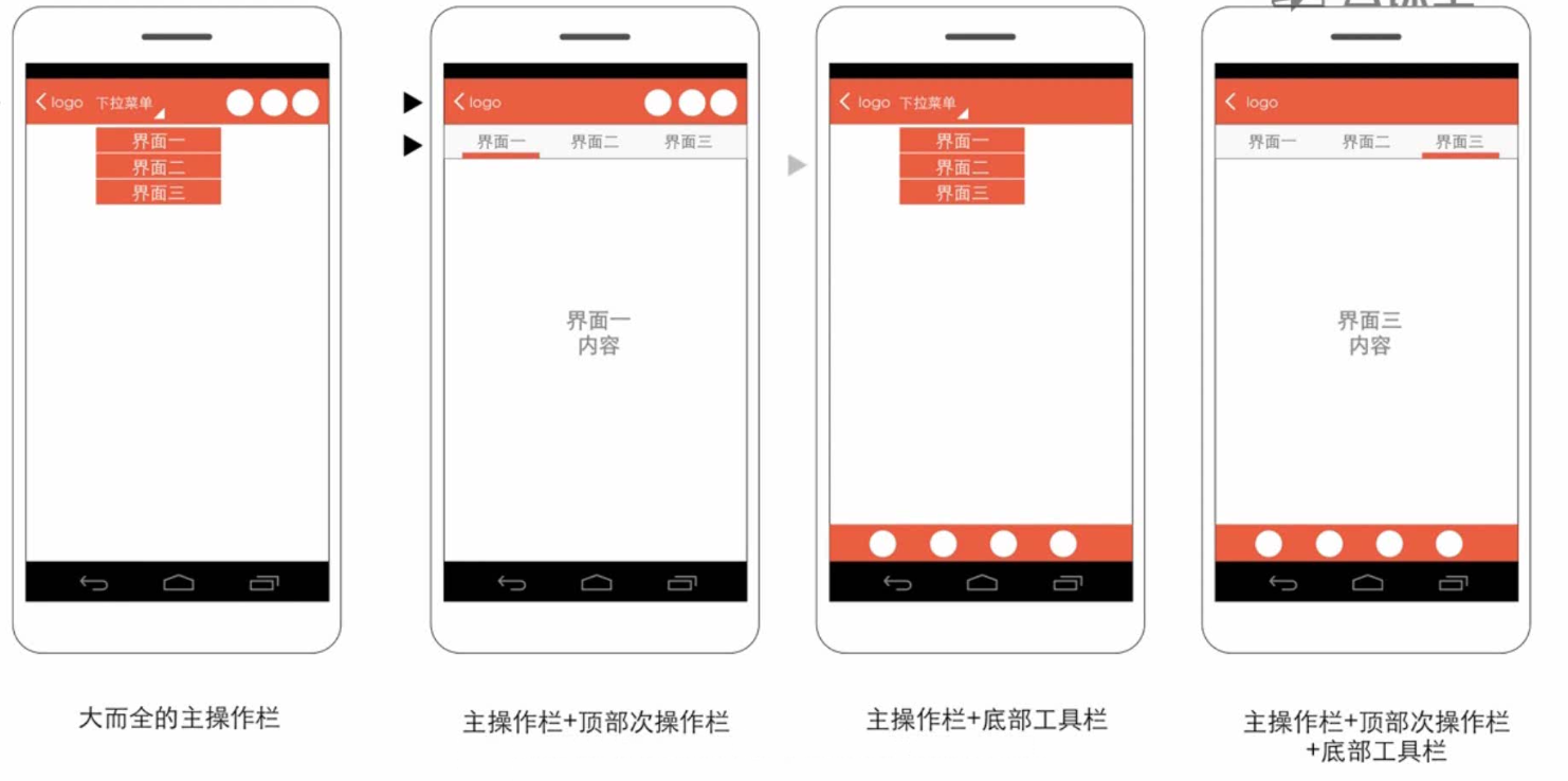 - 页眉-操作栏(Action Bar):操作栏用于实现app内视图的切换和层级间的导航(返回上层),还会放置一些重要控件。