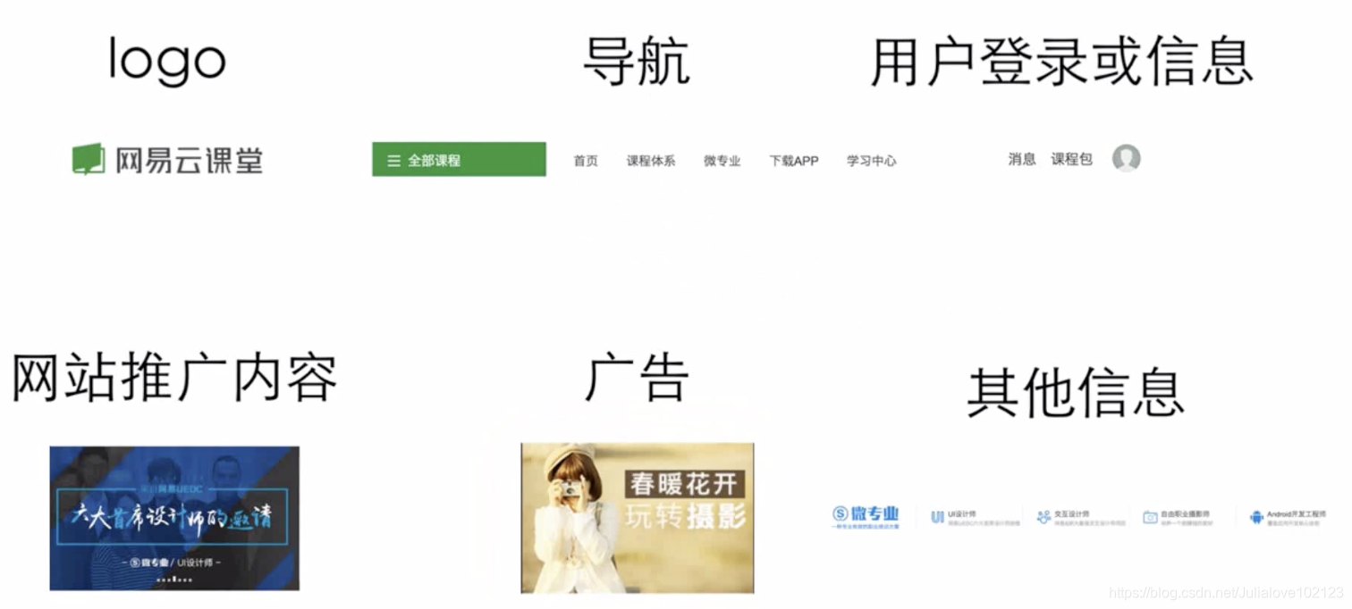 主要分为:logo、导航、用户登录、网站推广内容、广告、其他信息