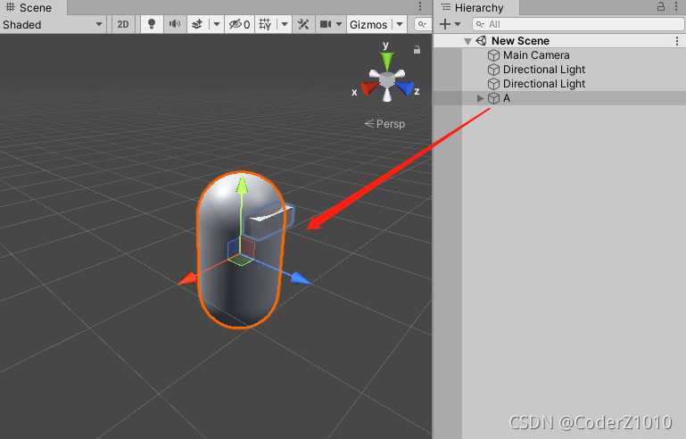 在程序运行过程中创建、实例化对象物体需要用到Object类中的 Instantiate 函数,例如,我们场景中有一个物体A: