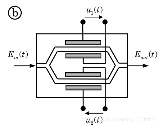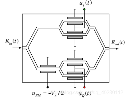 IQ调制器其实可以看做是相位调制器和强度调制器的结合,在QAM等高阶调制格式中运用广泛,基本结构如下图所示: