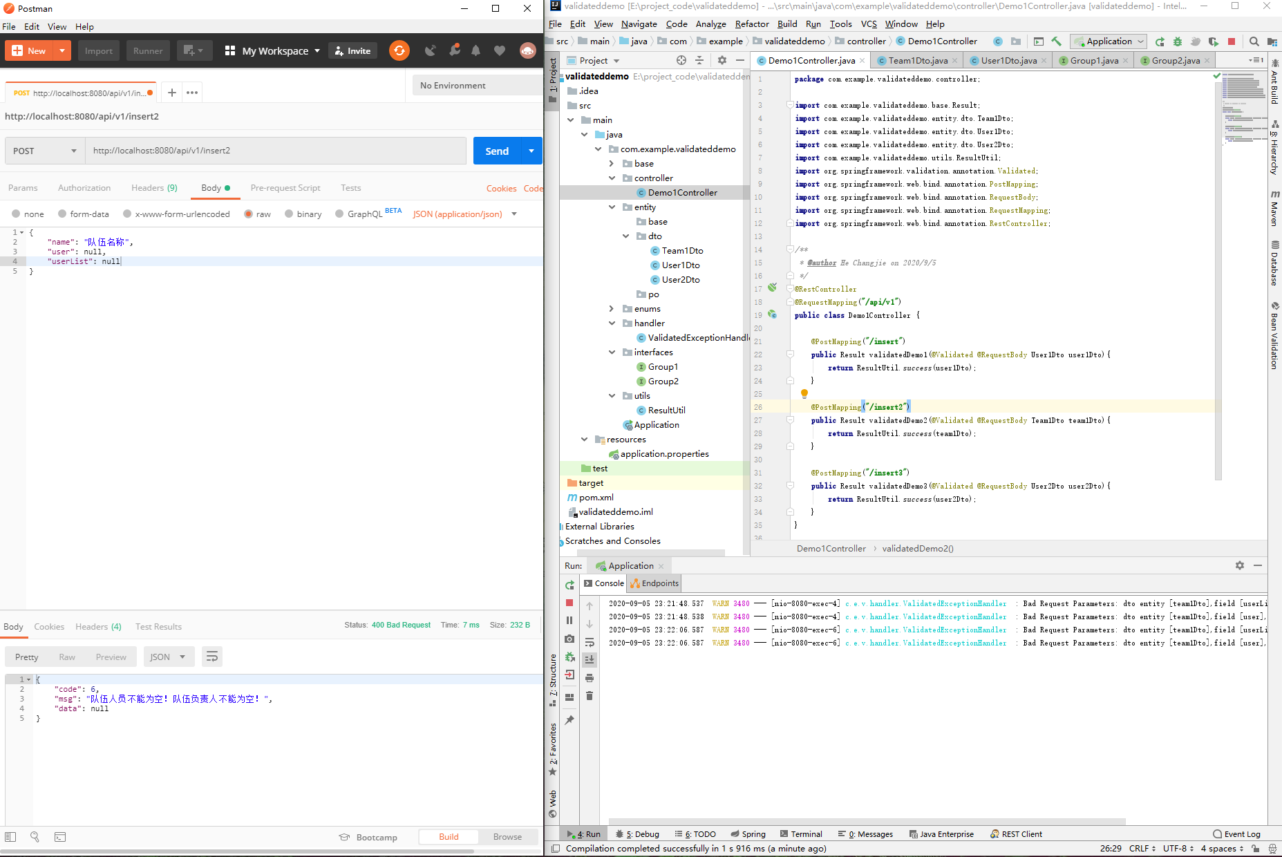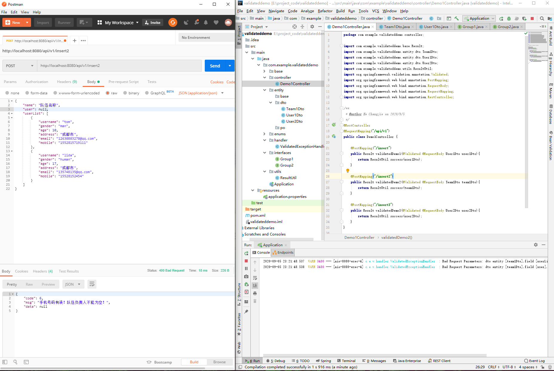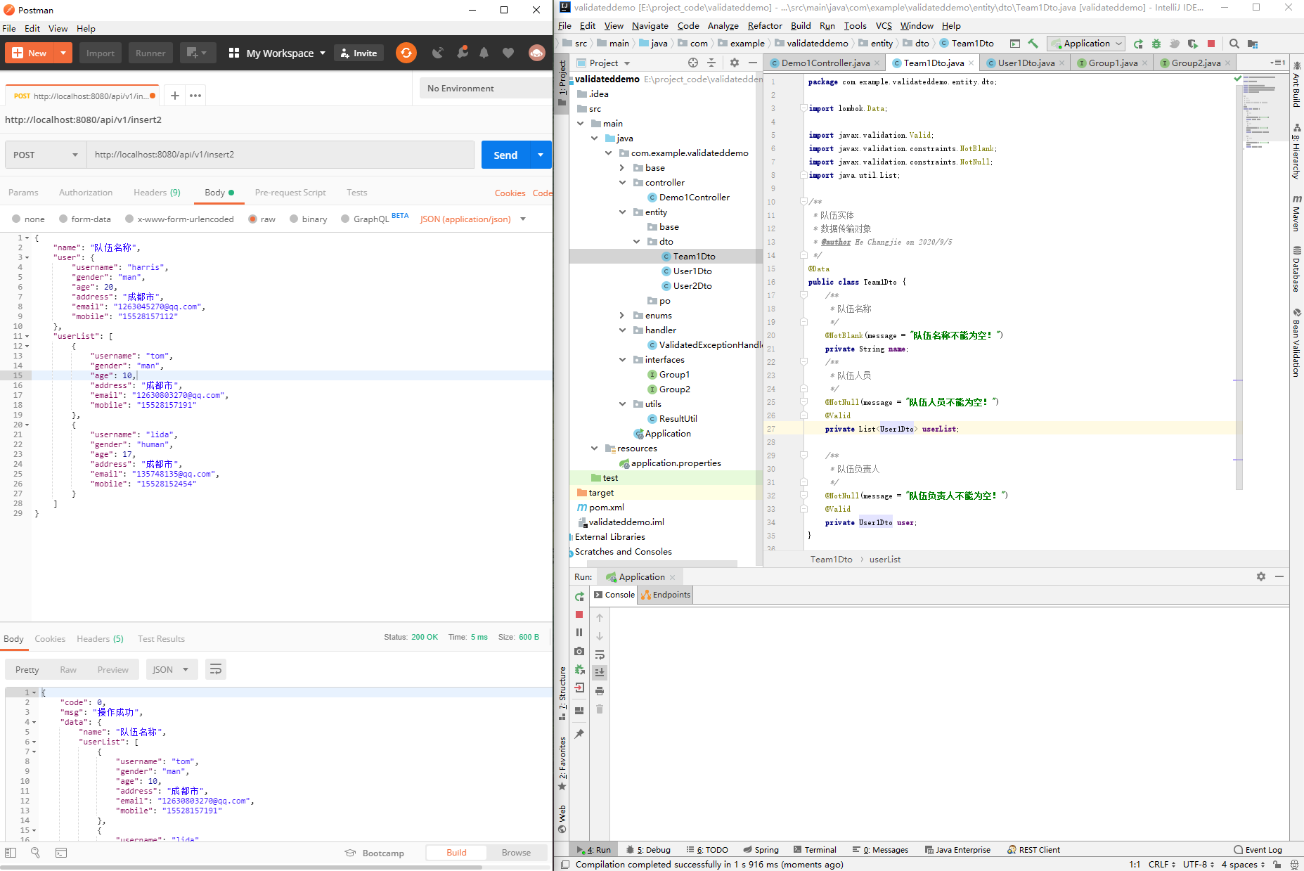 public class Demo1Controller {@PostMapping("/insert")public Result validatedDemo1(@Validated @RequestBody Use1Dto use1Dto){return ResultUtil.success(use1Dto);}@PostMapping("/insert2")public Result validatedDemo2(@Validated @RequestBody Team1Dto team1Dto){return ResultUtil.success(team1Dto);}