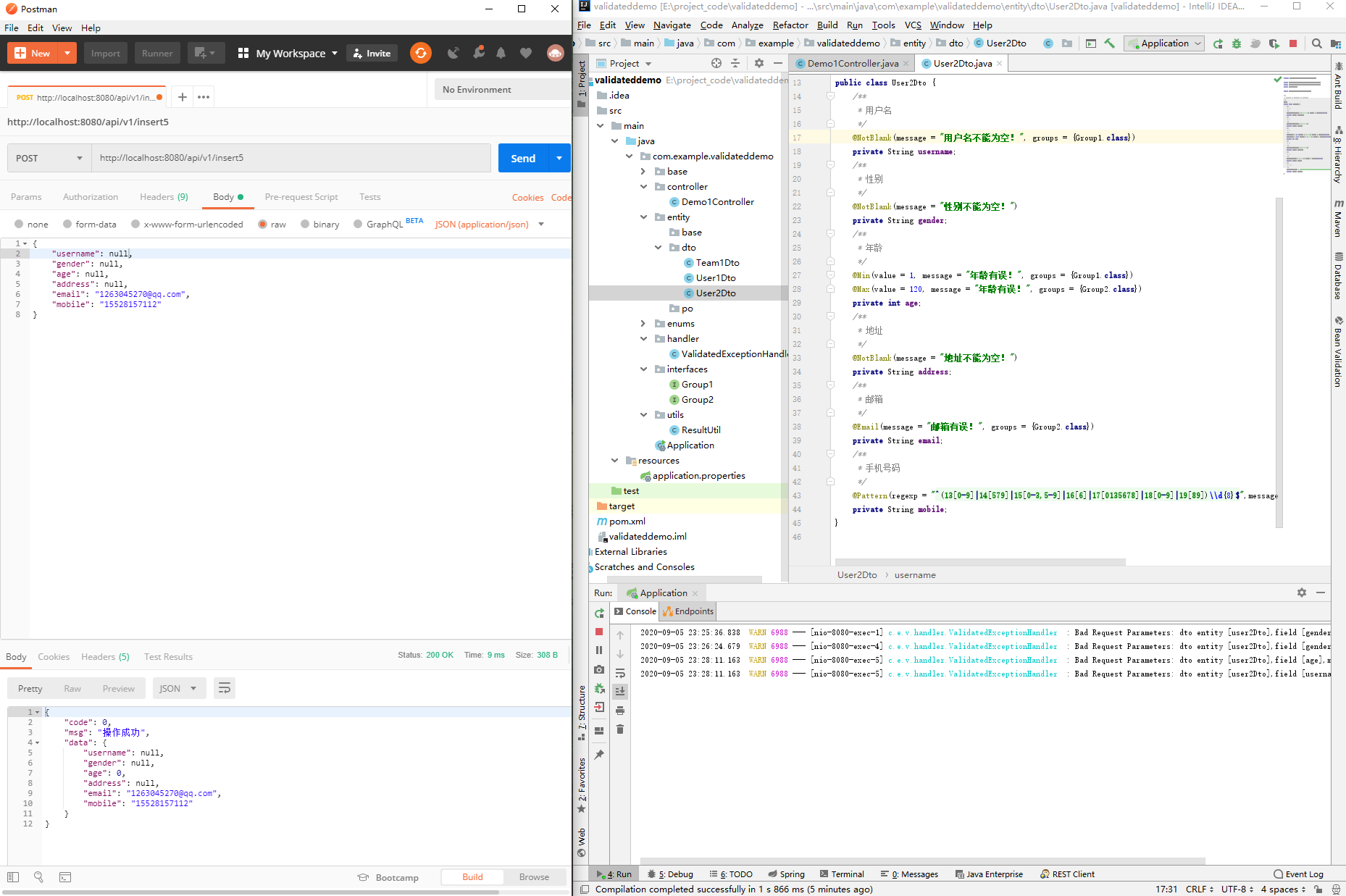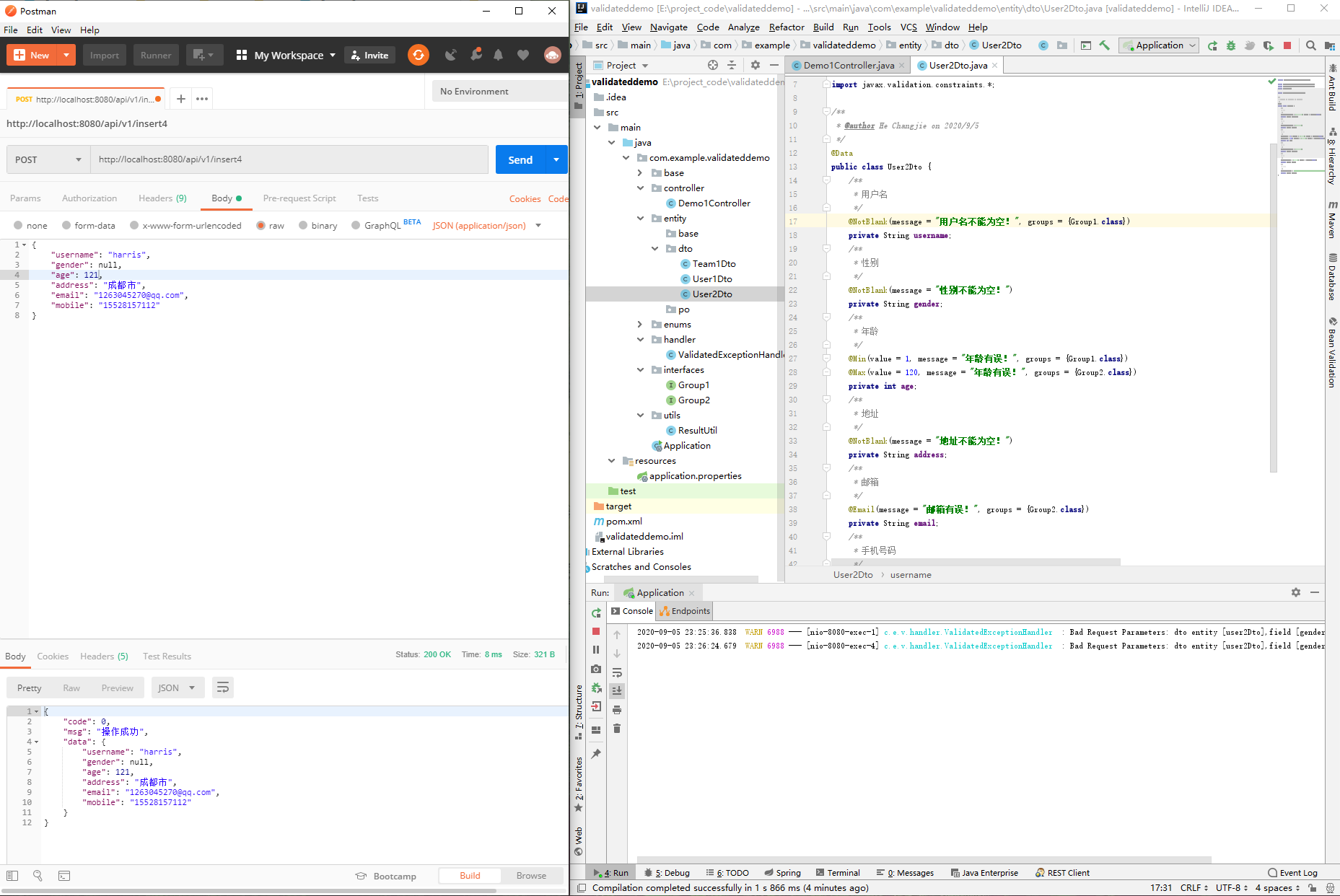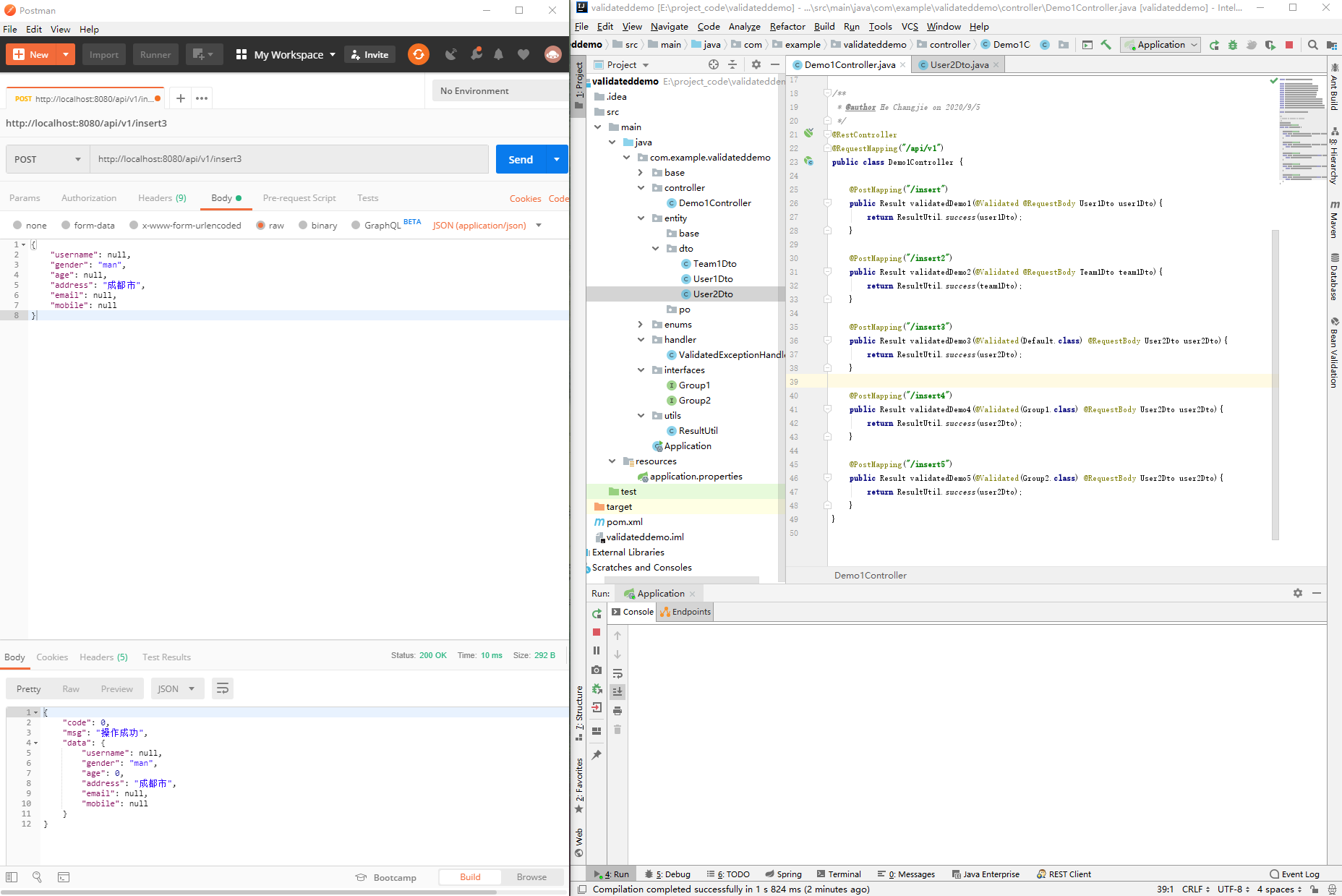 public class Demo1Controller {@PostMapping("/insert")public String validatedDemo1(@Validated @RequestBody Use1Dto use1Dto){System.out.println(use1Dto);return "success";}