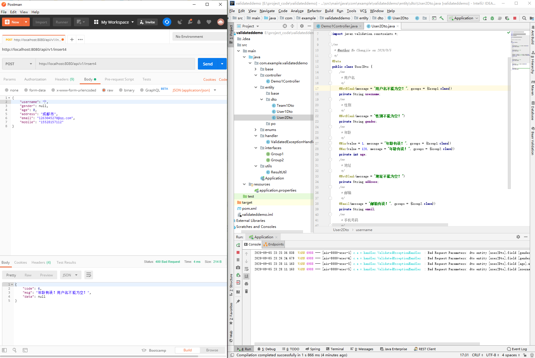 2020-09-05 21:48:38.106 WARN 9796 --- [nio-8080-exec-3] .w.s.m.s.DefaultHandlerExceptionResolver : Resolved [org.springframework.web.bind.MethodArgumentNotValidException: Validation failed for argument [0] in public java.lang.String com.example.validateddemo.controller.DemoController.validatedDemo1(com.example.validateddemo.entity.dto.UseDto): [Field error in object 'useDto' on field 'username': rejected value [null]; codes [NotBlank.useDto.username,NotBlank.username,NotBlank.java.lang.String,NotBlank]; arguments [org.springframework.context.support.DefaultMessageSourceResolvable: codes [useDto.username,username]; arguments []; default message [username]]; default message [用户名不能为空!]] ]