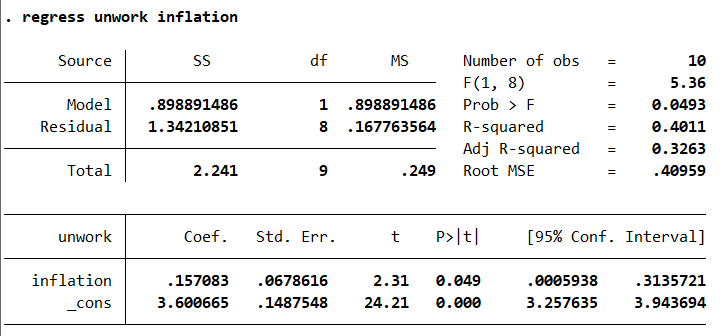 从上面的结果中我们可以看到,共有10个样本参与了分析,模型F值(1,8)=5.36,P值(Prob > F)=0.0493,说明模型整体是非常显著的。模型的可决系数(R-squared)为0.4011,模型修正的可决系数(Adj R-squared)=0.3263,说明模型的解释能力还是差强人意的。