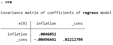 vce #本命令是获得参与回归的各自变量的系数以及常数项的方差-协方差矩阵