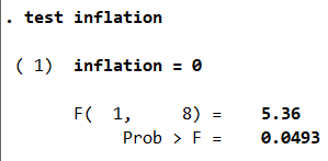 test inflation #本命令的含义是检验变量通货膨胀率的系数是否显著