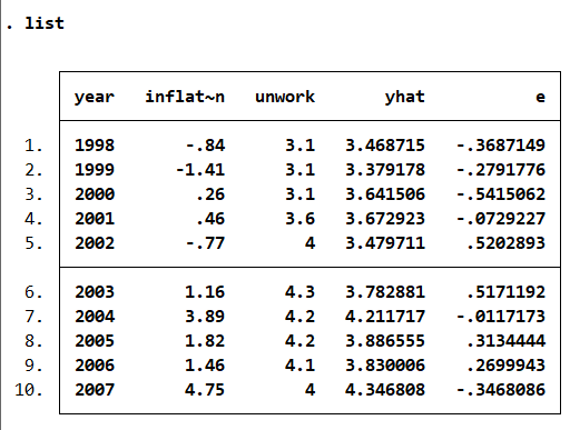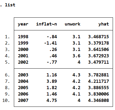 将数据年份拓展到2008年,假定该年的通货膨胀率为5%,把样本数据输入到数据文件中,然后进行预测,操作命令如下: