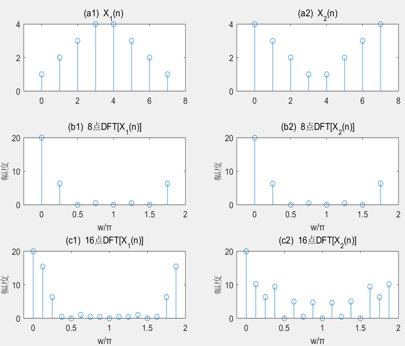 为上三角有限长序列,序列长度为8; 为下三角有限长序列,序列长度为8。选择FFT变换点数N分别为8和16两种情况进行频谱分析,打印出频谱特性曲线,观察不同N值, 和 的频谱特性曲线是否相同,进行讨论分析并得出结论。整个频谱分析过程通过Matlab软件进行程序设计实现。以下为Matlab的程序实现: