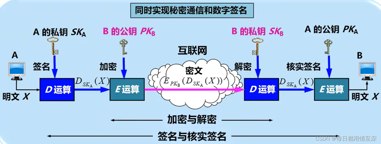 4、数字签名的过程,如下图所示发送端用A的私钥签名,接收端用A的公钥核实签名