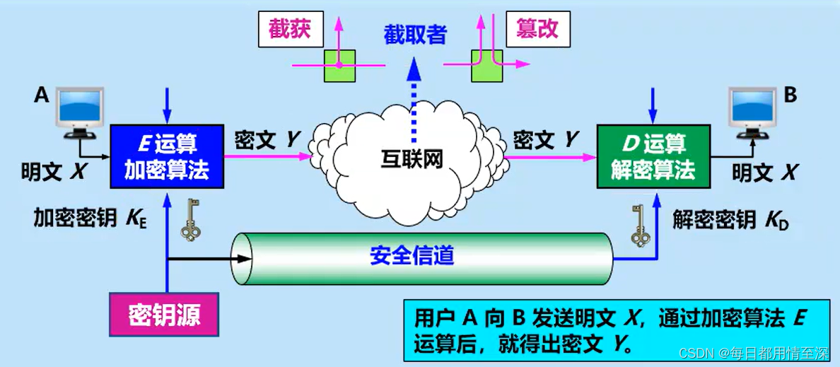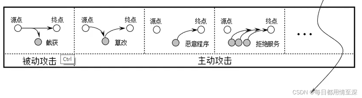 1、计算机网络上的通信面临以下两大类威胁:被动攻击和主动攻击,如下图所示: