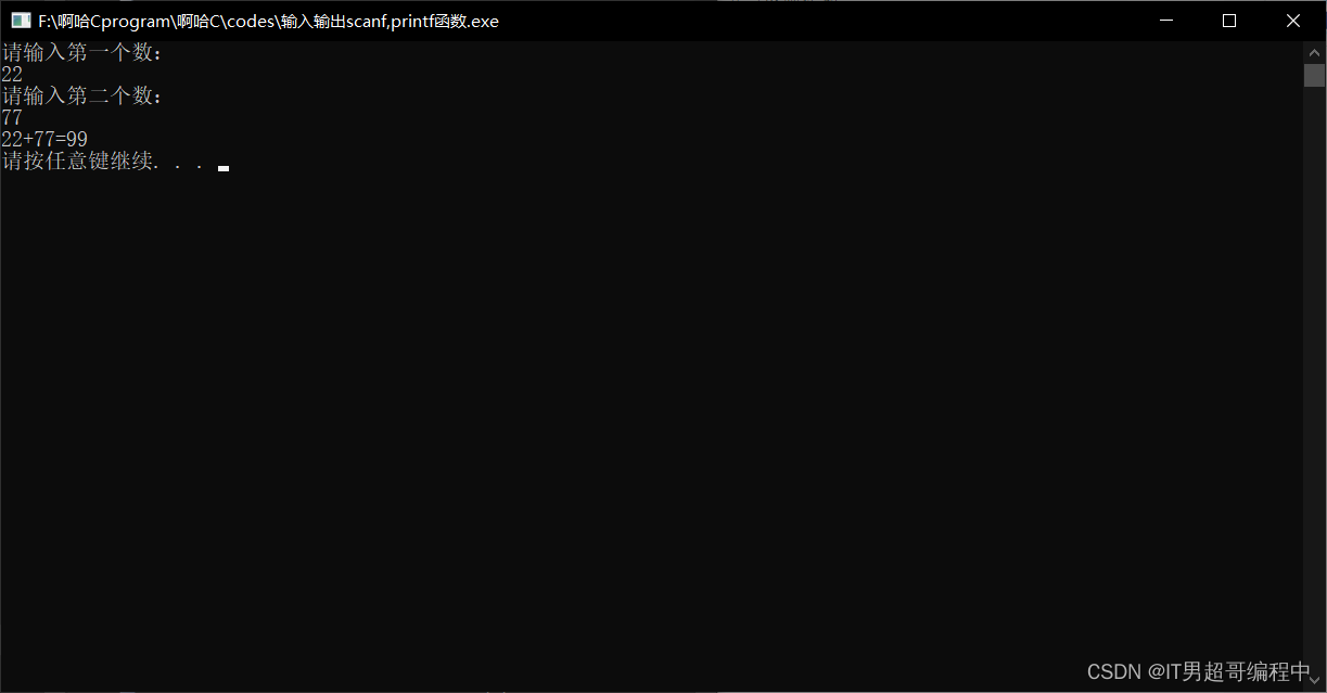 然后黑色框输出的应该是IT男超哥很帅,之后回车换行输出的是IT男超哥yyds,回车换行之后输出的结果是第1个加数加第2个加数赋值给第3个变量,然后注意printf函数中出现了%d,这里的%d表示的是,给输出的变量占一个坑,我们的输出结果要根据逗号后的变量名的变量值来输出,那么%d就是为逗号后面的变量占了一个位置。