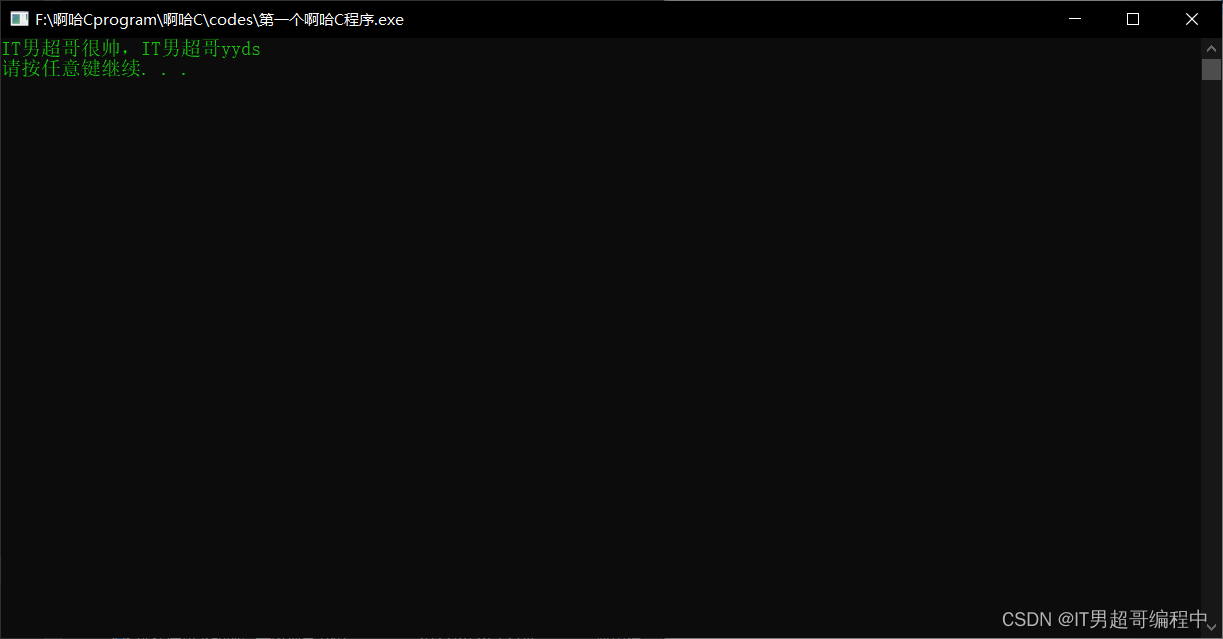 IT男超哥的第2段代码,主函数体输出的是IT男超哥很帅,IT男超哥yyds,黑色对话框一直在前方停留,展示在用户面前的对话框的文字是绿色,因为我使用了System函数,系统函数控制了输出文字的样式,它的颜色是绿色,int和return 0是互相搭配的,System pause是控制对话框停留的意思。
