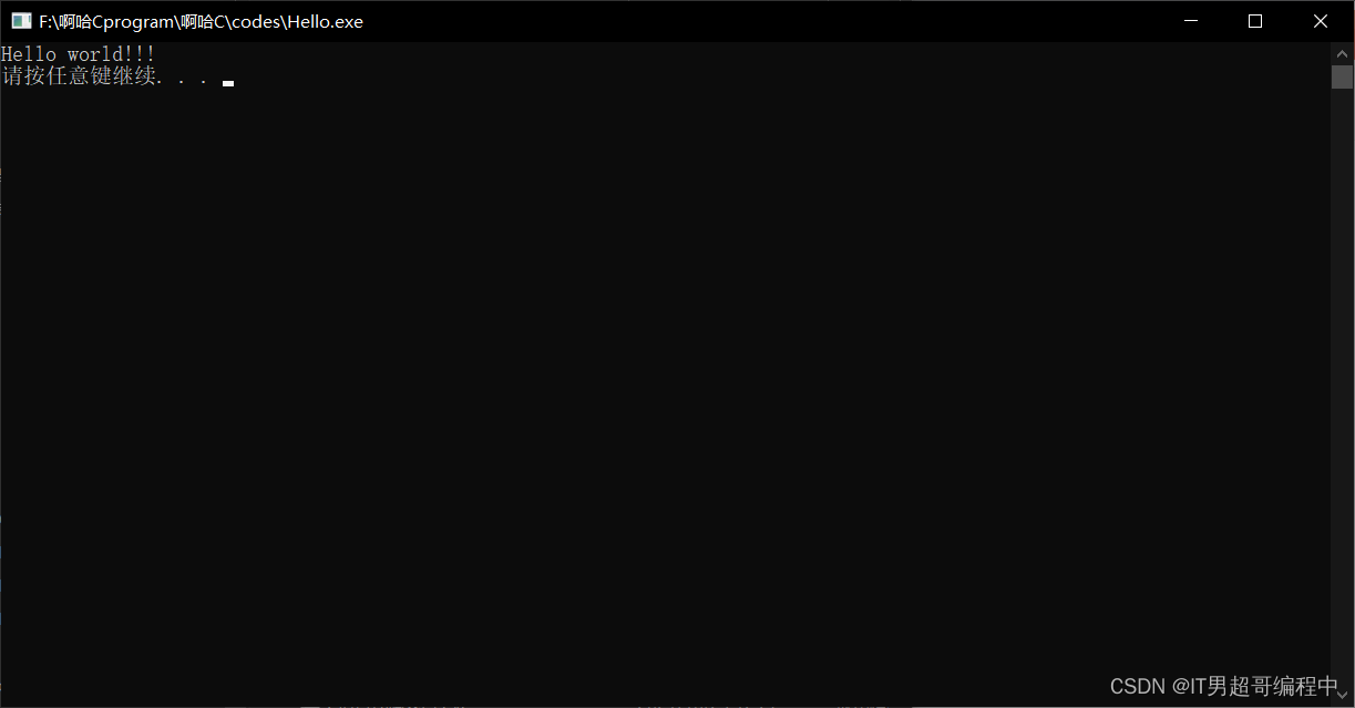Hello world!!!这是IT男超哥的第一段代码,也是最经典的程序代码,对于每一个新手来说,永恒不变的就是用hello world来开启你的编程世界,因此,编程的世界就是你的世界,你的世界由你做主,然后还要很耍酷的,让黑色对话框在我们的面前停留,要永远记得有Hello world这样的事情。由此也可以看出 C语言程序的大体框架,main函数组成的函数体,printf函数负责格式输出,system函数是让黑色对话框停留的意思,然后int和return 0是相互搭配的。