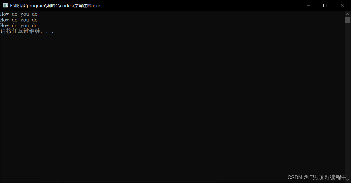 {printf("How do you do!\n");/*这是块注释*/ printf("How do you do!\n");//这是行注释,注释范围从//起至换行符止printf("How do you do!\n");/*这是块注释,如在本行写不完,可以在下一行继续写。这部分不产生目标代码。*/ printf("//How do you do!\n");/*printf("//How do you do!\n");return 0;*/system("pause");return 0;}