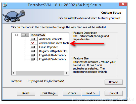 如上图箭头所示,在安装 TortoiseSVN 的时候,默认 command line client tools,是不安装的,这里建议勾选上。