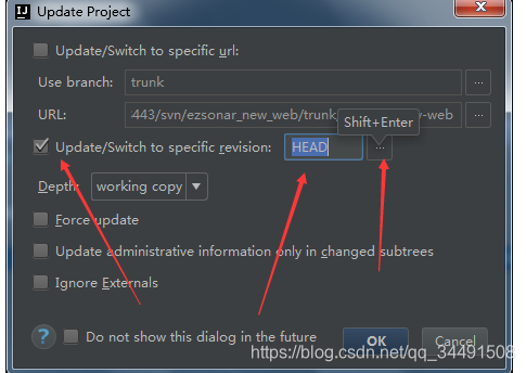 对勾打上,现在看到的后面的是head也就是最新的,或者,以前,我这就没选,那默认就是更新全部嘛。现在可以点击第三个箭头所指的地方,然后选择你要更新到哪个版本号,然后就可以啦。剩下的就不详细描述啦。