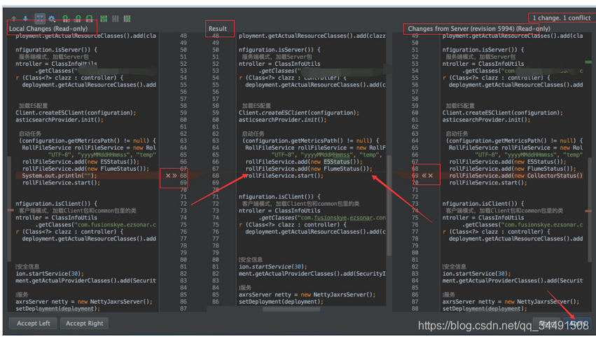 这个时候,你再看这个截图中间的2个红框,里面的箭头方向都是朝向中间的,要是你觉得哪边合适,也就是哪边的代码是OK的,那么就点哪边的箭头,然后抛弃的哪一边,就点对应的那个差号,就放弃啦。