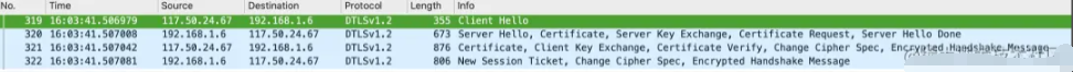 DTLS 最后的 Alert 是将客户端的 Encrypted Alert 消息,解密之后直接响应给客户端的,实际上 Server 应该回应加密的消息,这里我们的服务器回应明文是为了解析客户端加密的那个 Alert 包是什么。