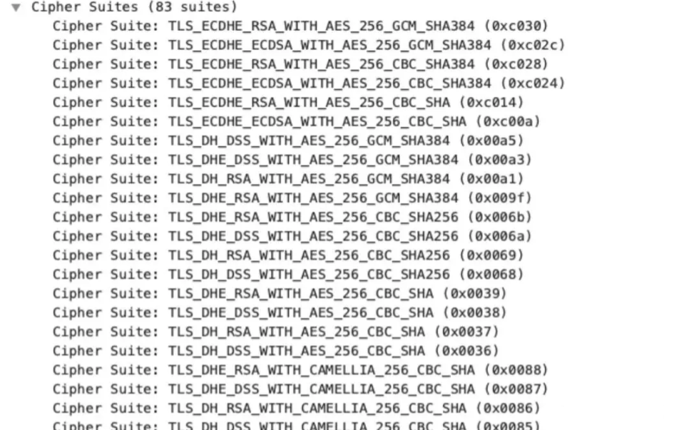 CipherSuites:Client 给出自己能支持的加密套件 CipherSuites,Server 收到后选择自己能支持的回应一个,比如 TLS_ECDHE_ ECDSA_WITH_AES_256_CBC_SHA (0xc014),加密套件确定了证书的类型、密钥生成算法、摘要算法等。