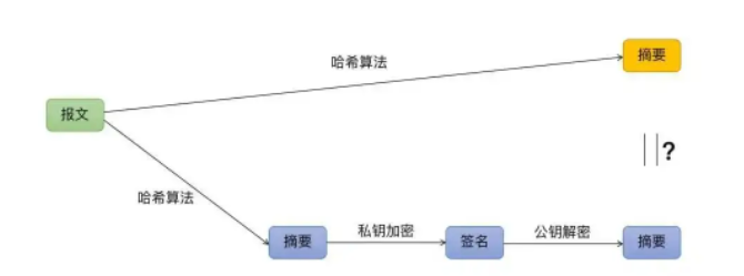 发送者 A 将报文摘要(报文通过 SHA-1 等哈希算法生成摘要)通过私有密钥加密生成签名,与明文报文一起发给接收者 B,接收者 B 通过对收到的信息进行计算后得到两份报文摘要,比较这两份报文摘要是否相等可以验证报文是否被篡改,即: