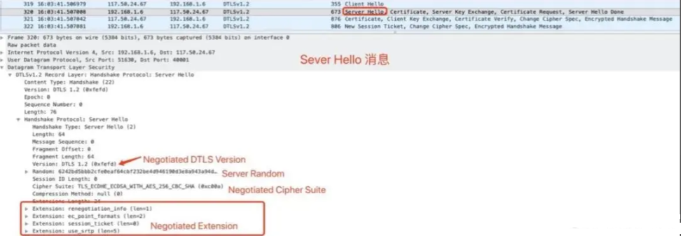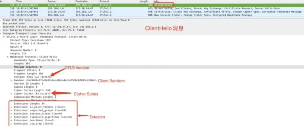 ClienHello 和 ServerHello 协商 DTLS 的 Version、CipherSuites、Random、Extensions。