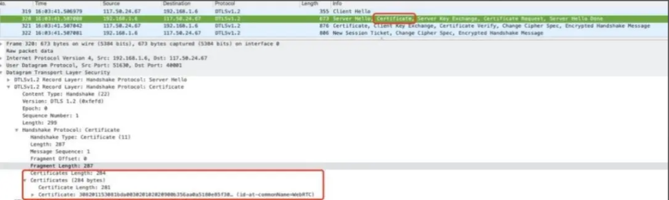 在 WebRTC 中,通信的双方分别产生自签名证书(a=fingerprint:)和 DTLS 角色(a=setup)添加到 sdp 中,通过安全的信令通道 (https),进行 sdp 交换协商。在 DTLS 握手阶段,先进行数据签名和校验,如果数据被攻击者篡改,校验失败,通信双方立刻可以发现。