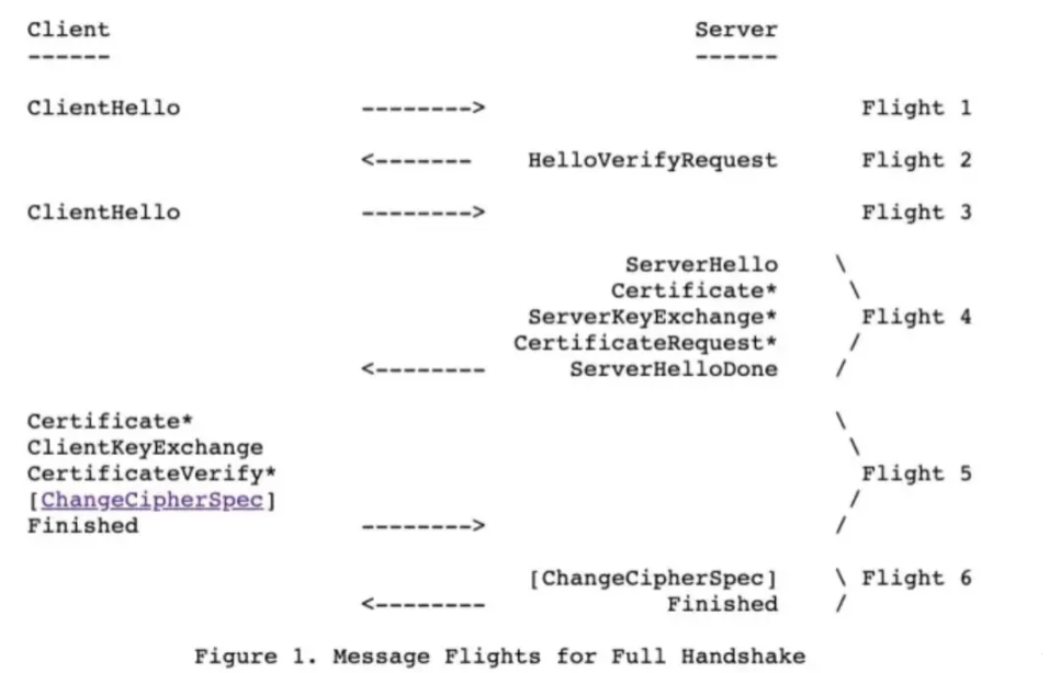 DTLS 握手协议流程如下,(参考 RFC6347)。