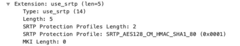 ClientHello 中的扩展信息定义了 RFC5764 4.1.2. SRTP Protection Profiles 和 srtp_mki。