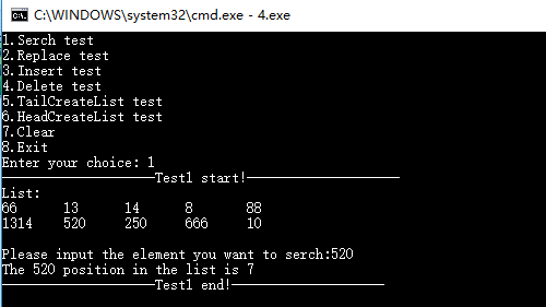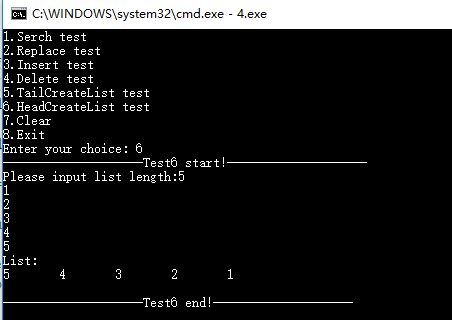 {int cmd;printf("1.Serch test\n");printf("2.Replace test\n");printf("3.Insert test\n");printf("4.Delete test\n");printf("5.TailCreateList test\n");printf("6.HeadCreateList test\n");printf("7.Clear\n");printf("8.Exit\n");do{printf("Enter your choice: ");scanf("%d",&cmd);}while(cmd<0||cmd>8);return cmd;