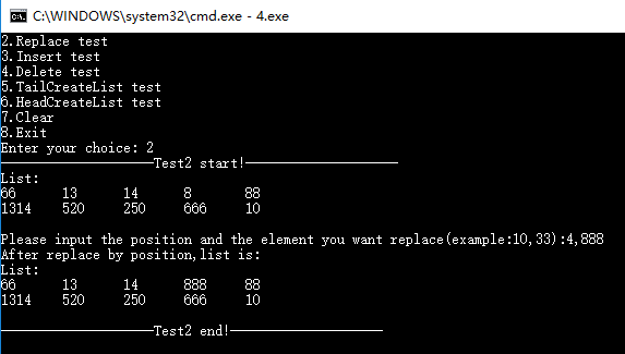 {int replacePos = 0, replaceElem = 0; //存储替换的位置,替换的元素printf("--------------------%s start!--------------------\n",__FUNCTION__);PrintfList(L);printf("Please input the position and the element you want replace(example:10,33):");scanf("%d,%d",&replacePos,&replaceElem);L = Replace(L,replacePos,replaceElem);printf("After replace by position,list is:\n");PrintfList(L);printf("--------------------%s end!--------------------\n",__FUNCTION__);printf("\n");