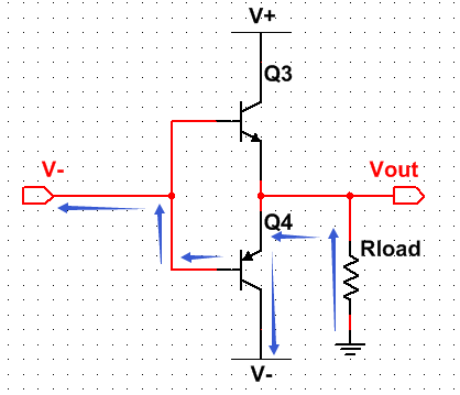 当Vin电压为V-时,下面的三极管有电流流出,Q4导通,有电流从上往下流过。
