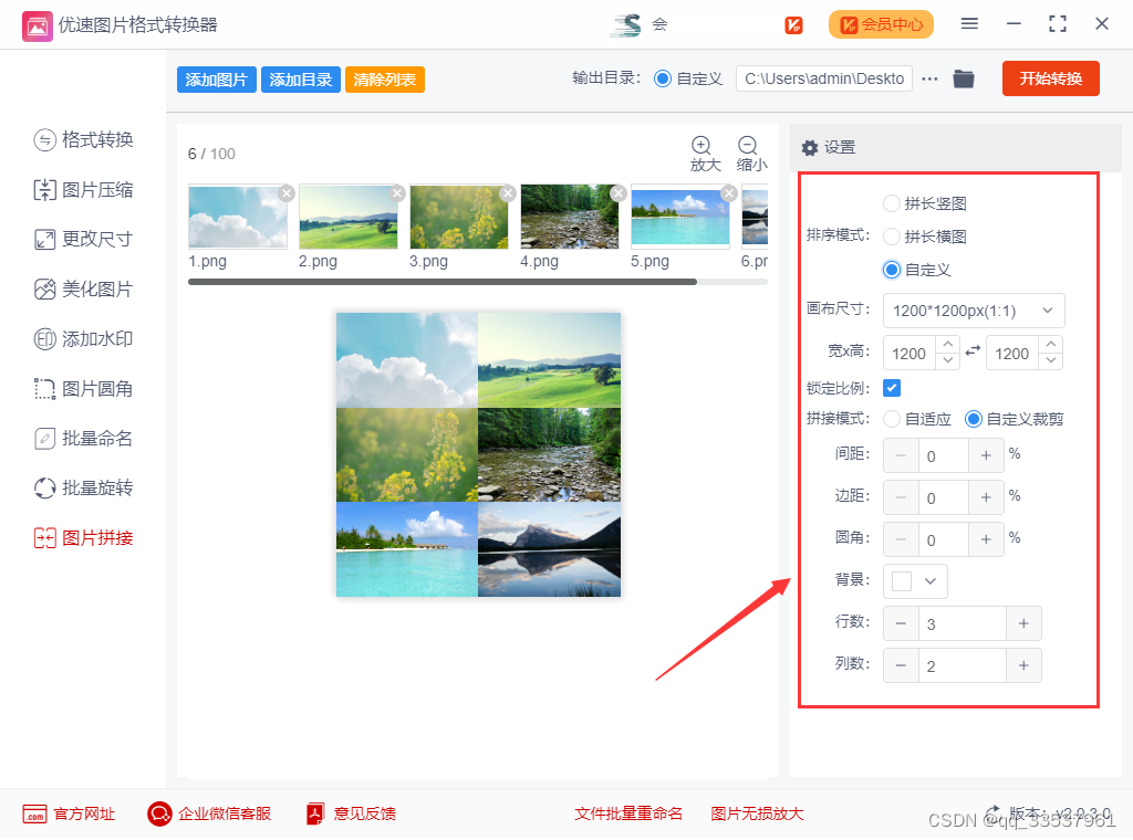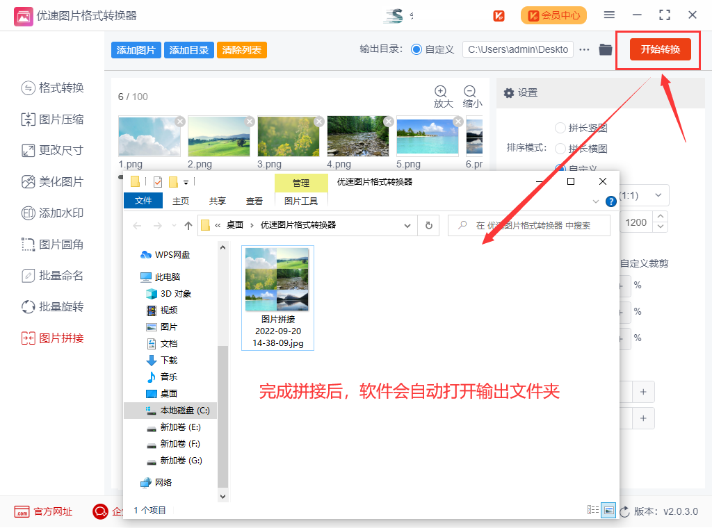 第四步:所有参数设置完毕后,我们点击【开始转化】红色按钮,启动拼接程序。当拼接完成后,软件会自动打开输出文件夹,拼接好的图片就在这个输出文件夹中,方便我们查看。