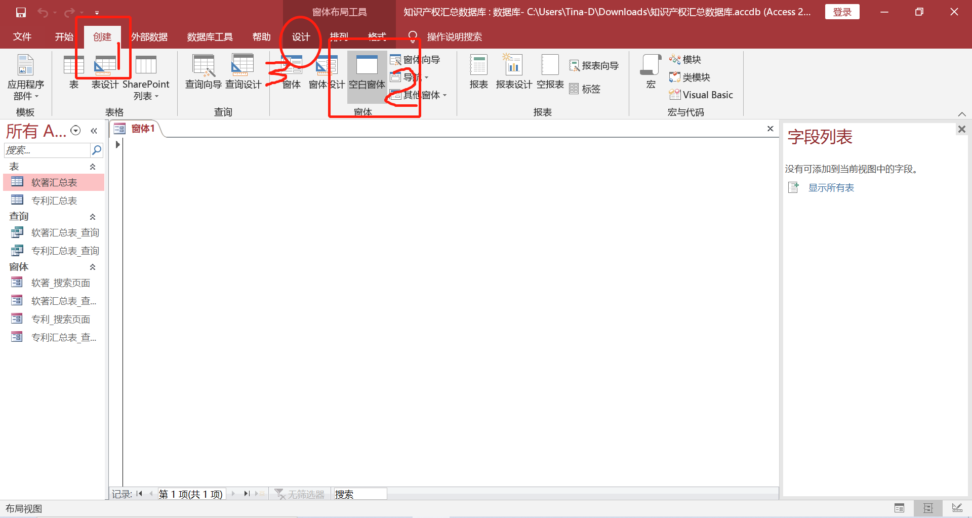 1.1. 点击“创建”➡“空白窗体” 将出现一个什么组件、按钮都没有的空白窗体, 然后点击“设计”,将会转到控件选择按钮。