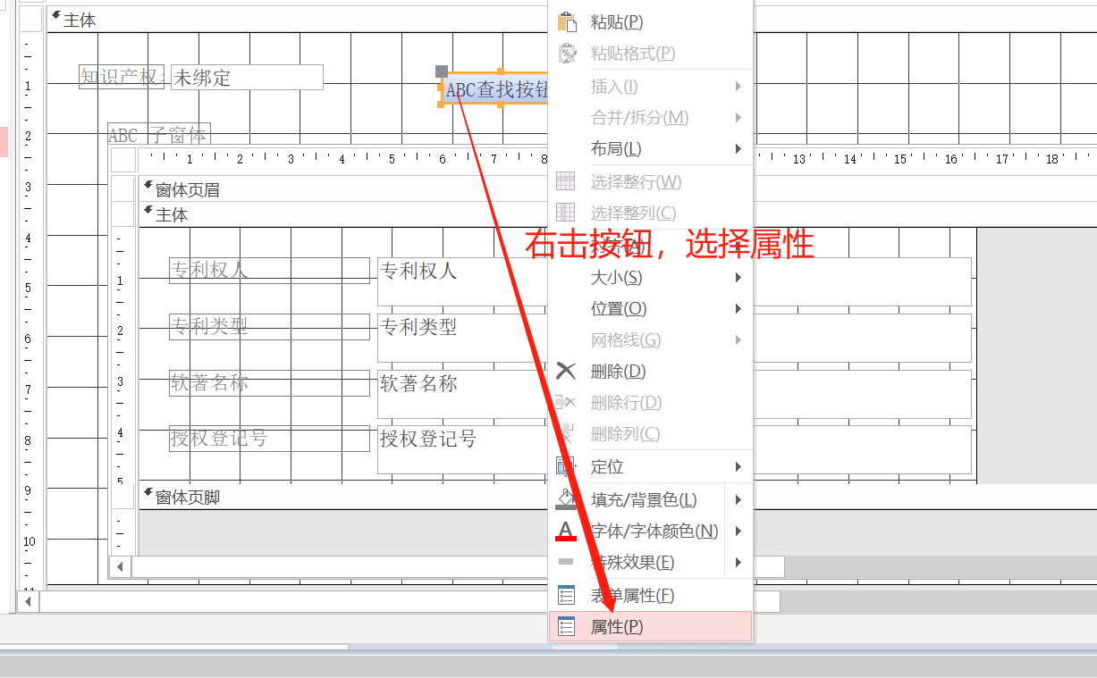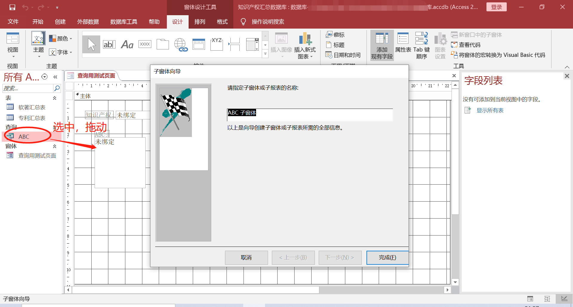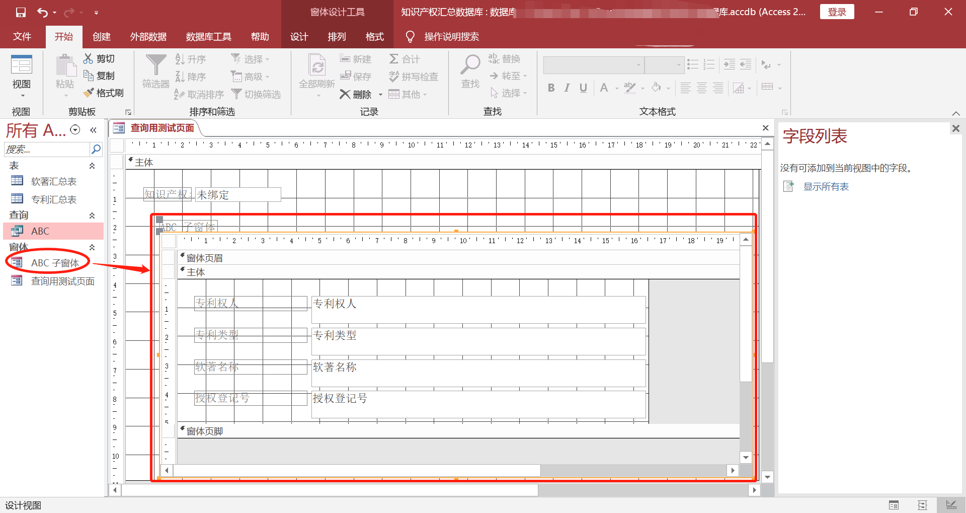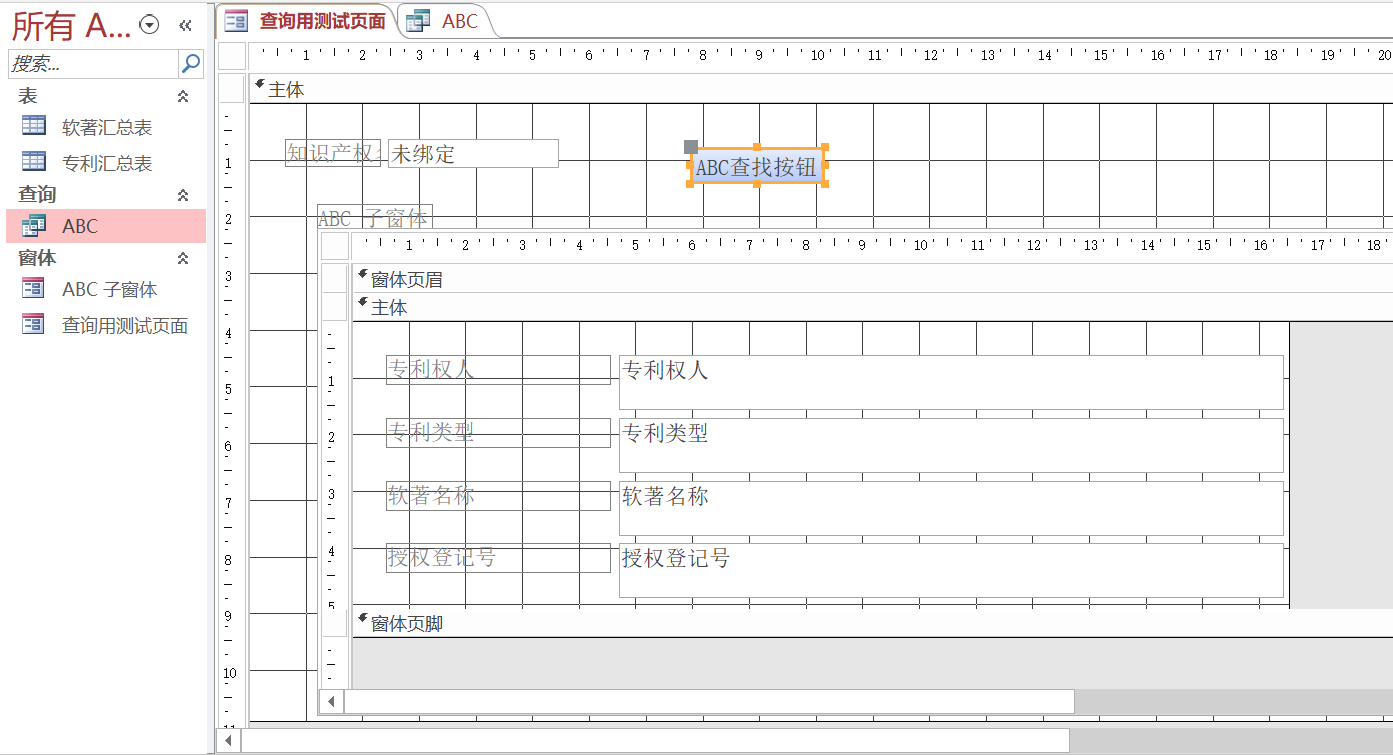 2.7 选“查询用测试页面”窗体,进入设计视图,然后拖动左侧导航栏中的 ABC 查询对象到 “查询用测试页面 ” 窗体中, 作为子窗体,并保存