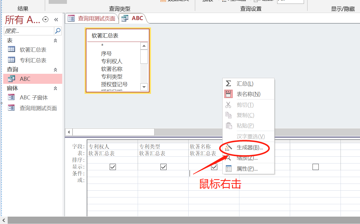 进入ABC 查询对象的设计视图,选则要用于搜索用的字段,在下方条件中右击,选择“生成器”,打开“表达式生成器”,编写规则。要先编辑模糊查询功能,再拖成子窗体才行!!!!!!