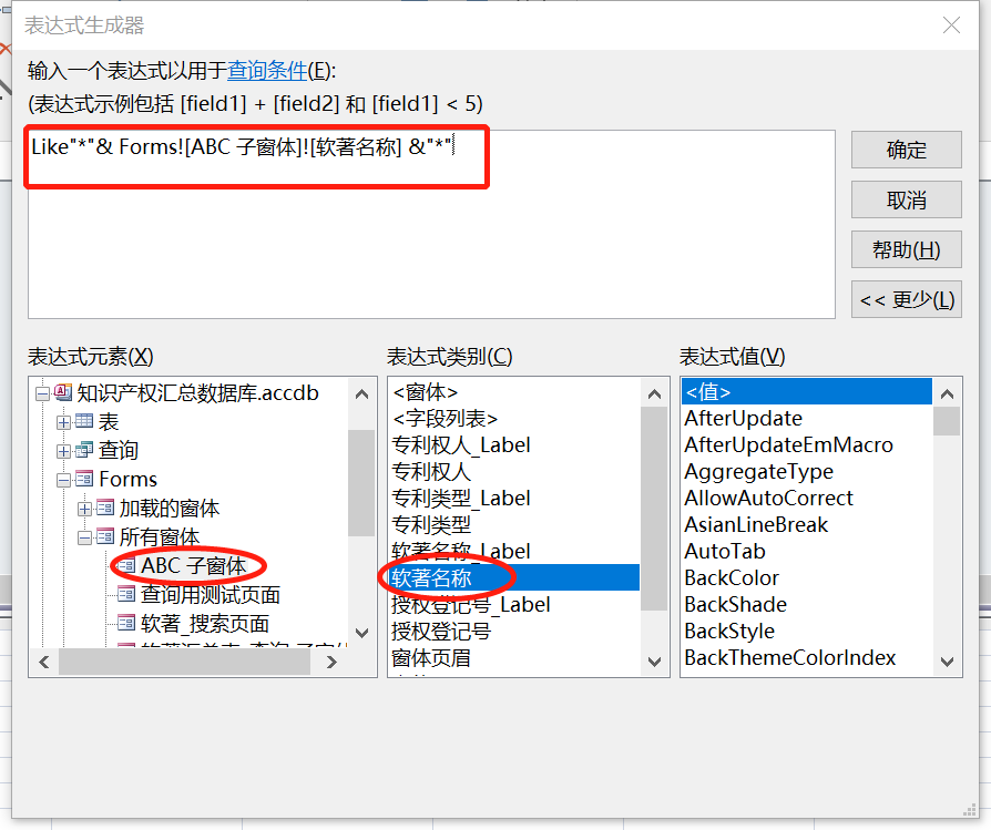 Like"*"& Forms![ABC 子窗体]![软著名称] &"*"
