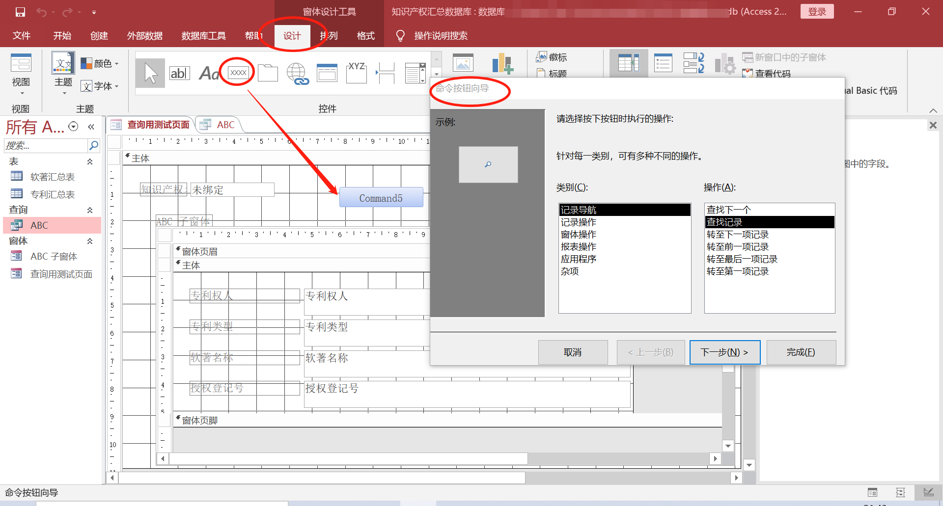 3.1 再次进入 “查询用测试页面”窗体的设计视图 ,点击上方的设计,这次是添加按钮控件。选择,点击要添加的按钮的位置,出现对话框,主要是选择和设定名称。