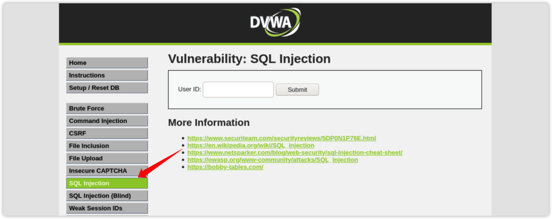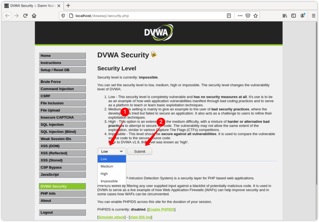 为了让我们更容易理解 SQL 注入的原理,所以先手动将 Security 级别调整为 low